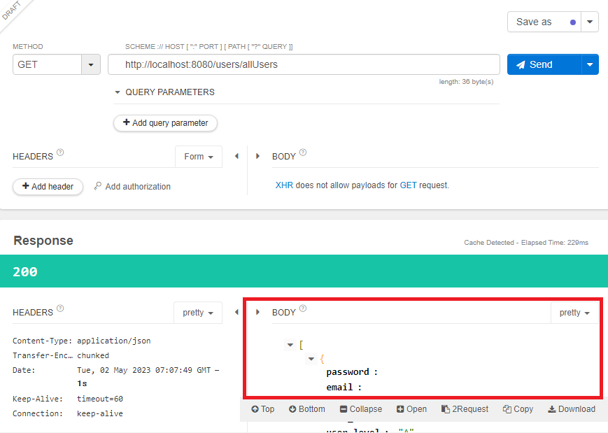 서버 구동 후 localhost:8080/user/allUsers로 GET 요청을 보내면