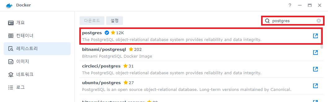 설치된 Docker를 실행하여 레지스트리 tab에서 postgres를 검색하고 공식 이미지를 다운로드한다.