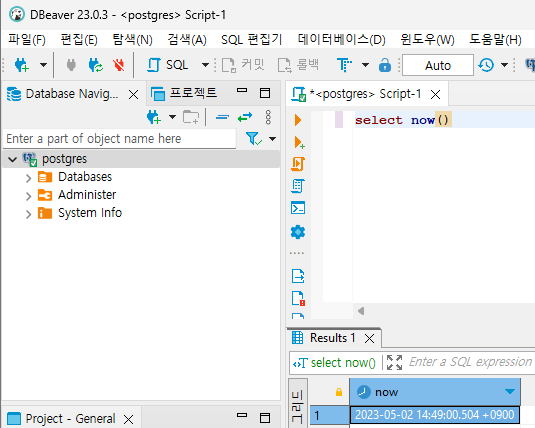 접속 확인 후 SQL 편집기를 열어 select now()를 조회해본다.