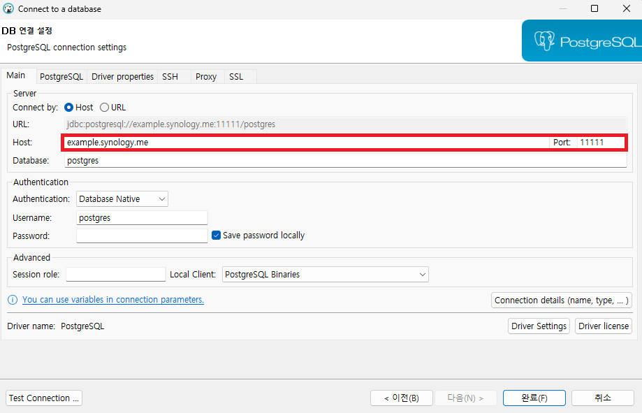 Host에 본인의 NAS 주소, port에 외부 액세스를 위해 열어둔 포트를 입력하고 완료를 누른다.