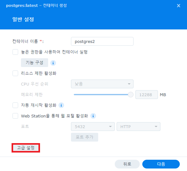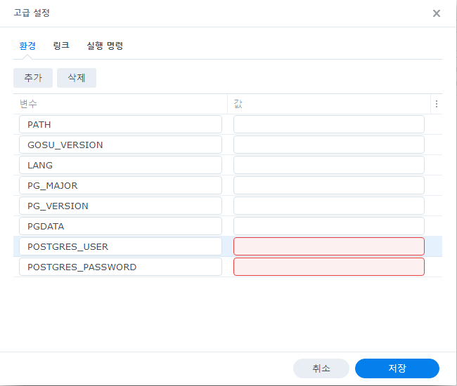 고급 설정을 열어 환경 탭에 추가 버튼을 눌러 POSTGRES_USER, POSTGRES_PASSWORD를 설정해준다.