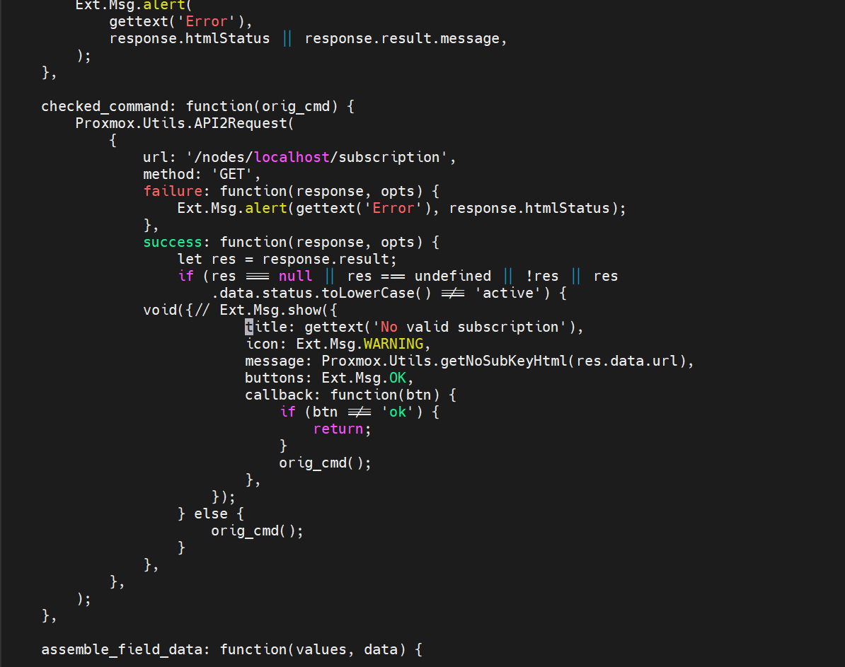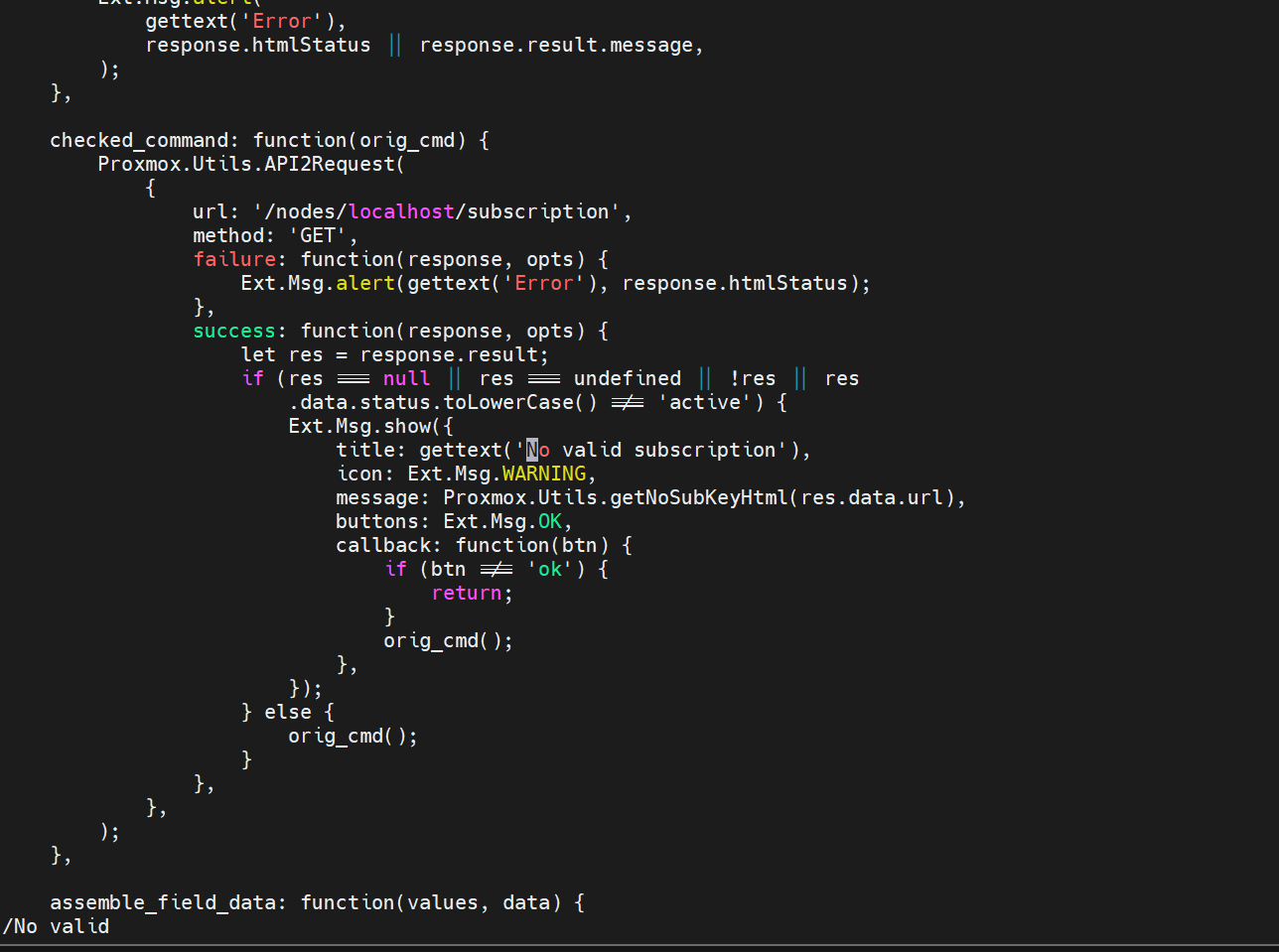vi 에디터로 proxmoxlib.js를 편집한다.