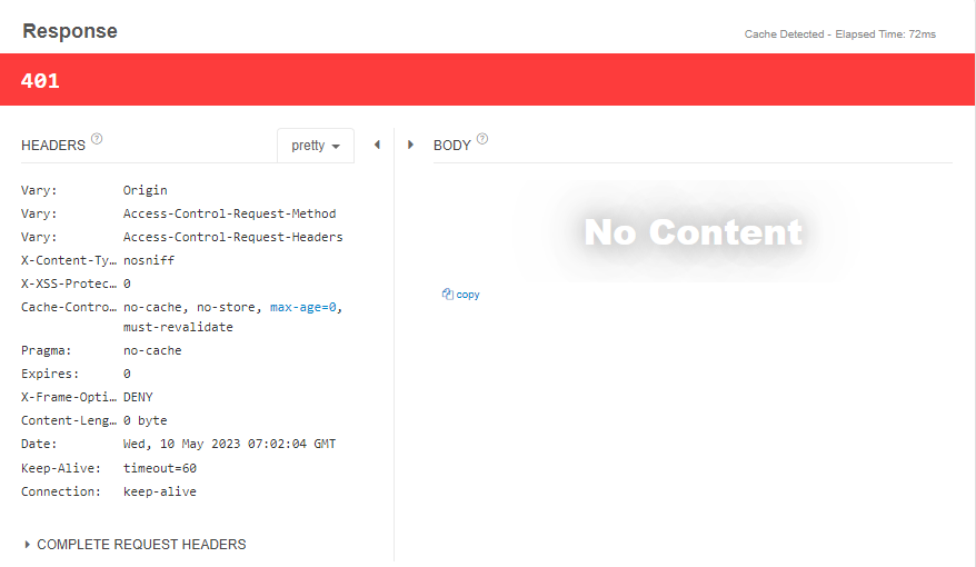 이렇게 401 메세지가 리턴되는데, 서버의 콘솔창을 확인하면